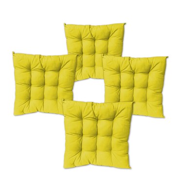 Ideal for resin/plastic or wooden chairs, set of 4 These cushions are made of high quality and long-lasting materials. They come with 2 strings to attach on the back of the chair. They have a thickness of more than 5 cm. Product Details Material Cotton Dimensions 42 x 6 x 42cm Color Yellow Shape Square Origin Lebanon