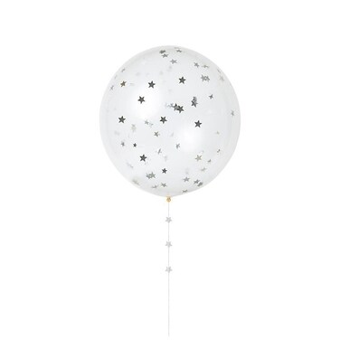 The confetti is created with pale tissue paper and silver mylar. The kit comes with a sheet of silver star stickers and bakers twine.Pack contains 8 balloons, bag of confetti, twine and a sticker sheet. Balloon size: 18 inches.