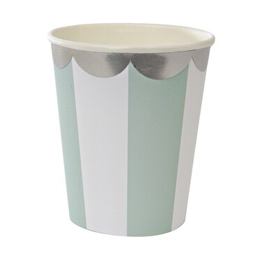 - Broad vertical pastel stripes make these party cups really stand out and they are finished with a scollop band embellished with silver foil.
