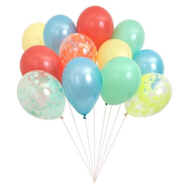 They are ideal for baby showers, birthday parties, or any fun celebration.The set includes 12 balloons in red, yellow, pastel green, metallic baby blue and clearThe clear balloons are pre-filled with tissue paper confetti in striking colours - one with neon yellow, one with mint and one with neon coralEasily hang up the balloons with the neon coral cord included in the setSuitable for ages 8+Packaging made using eco-friendly paperPack of 12 in 7 coloursInflated balloon size - 305mm