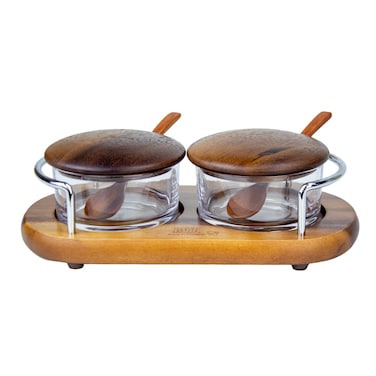 BILLI 2 Glass Spice Jars - Condiment Pot Storage Jars with Wooden Lid, Spoon, Wooden Base and Chrome Handle - Glass Canisters Seasoning Box for Condiment