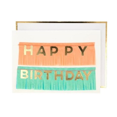 Crafted from fringed tissue paper with gold foil detail.Detachable garlandTissue fringe with gold foil detailWhite envelope with gold foil edgeInside Message: Happy BirthdayMade from eco-friendly paperPack dimensions: 184 x 133 x 3mm
