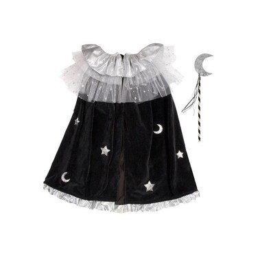 A fabulous outfit to wear for Halloween, or whenever you fancy casting spells in style!Hat sold separatelyThe cape is made from black velvet, with chunky silver glitter star and moon detailsIt features a collar crafted from white tulle layers and shiny silver lame, and embellished with silver glitter starsIt has a shiny silver lame ruffle at the bottom of the capeThe wand is covered in black and white satin ribbons, with ribbon adornments, and is topped with a silver glitter moonSuitable for ages 3-6 yearsProduct dimensions:Neck - 18 inches, Length - 28 inches