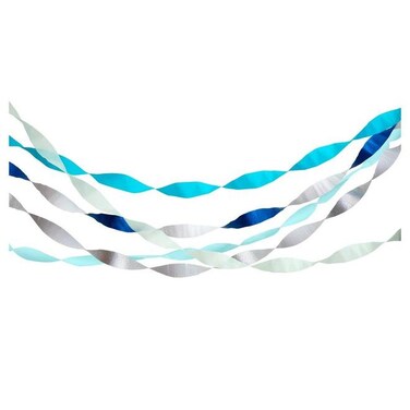 The streamers are crafted from crepe paper in blue, mint, dark blue, metallic blue and metallic silver