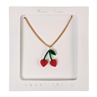 It also comes presented in a luxurious white envelope box.Adjustable Chain length 18" to 20"Plastic red cherriesBrass chain and clasp