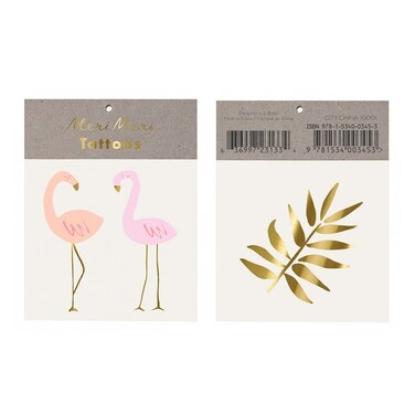 - These temporary tattoos are perfect for a tropical party or whenever you want to get a summery feeling. Featuring 2 funky flamingos and a shiny gold leaf.