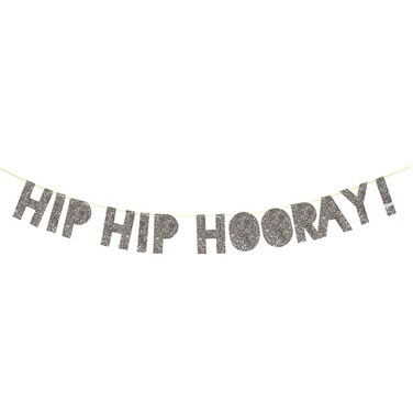 - A shimmering Hip Hip Hooray garland for a special party embellished with chunky silver glitter and suspended with a neon yellow cord.