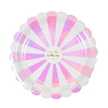 - Create a shimmering effect with these brightly colored party plates, decorated with an iridescent foil stripe pattern and finished with a scollop edge.