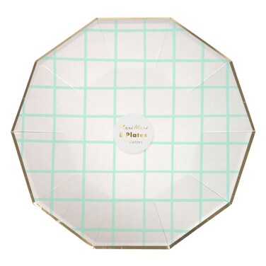 - A set of elegant party plates decorated with a grid pattern in pale mint and embellished with a shiny gold border.