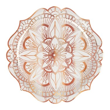 - These elegant party plates are sumptuously decorated with a stylised floral pattern embellished in shiny rose gold foil and finished with a shaped edge.