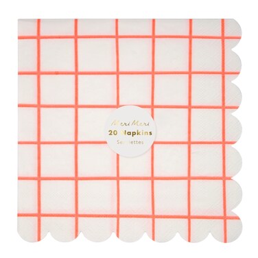 - A set of elegant party napkins decorated with a stylish square grid pattern in coral pink and finished with a scollop edge.