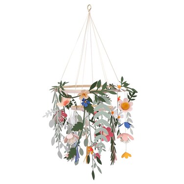 Why have a plain chandelier, when you can have one with beautiful paper flowers and leaves? This is a wonderful way to add colour and style to any room. The pennants are pre-attached to a length of ribbon, backed with a hook and loop fastener. Simply attach these to the wooden rings, which also have hook and loop fasteners.Simply wrap the 2 paper wreaths around the hoops. The flowers have pretty pompom and tissue paper embellishments. It has a gold tone ring to hang it.Includes easy-to-follow instructionsSimple self assembly requiredPackaging made using eco-friendly paperProduct dimensions: 356 x 819 x 356mm