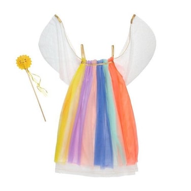 - This gorgeous rainbow dress-up kit is perfect for a little one to transform into a beautiful fairy. The dress is made from layers of colourful tulle, for a spectacular effect, and has a polycotton lining. It has floaty layered tulle wings attached, with a glittery gold border.