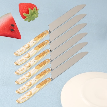 Ramadan Design Heavy Duty Ceramic Handle Dinner Knives Set of 6 Stainless Steel Butter, Spreader Cheese Knife ,Table Knifes, Silverware Butterknives,Steak Knives,Fruit Knife -Gold And White Color