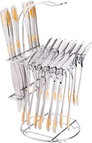 Royalford 25 Piece Stainless Steel Cutlery Set With Display Stand RF10315, Gold Plated
