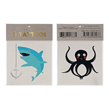 With a shark and octopus embellished with shiny silver foil.Pack contains 2 temporary tattoos. Tattoo sheet size: 3 x 3 inches.