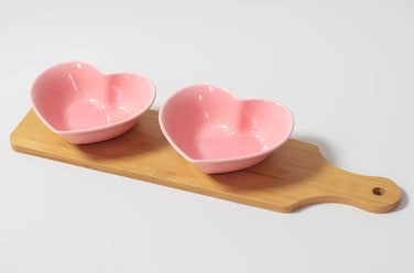 Serving Bowl, Plate Heart Shape With Bamboo Tray With Handle Snacks, Nuts, Fruits, Desserts Ceramic Pink Color