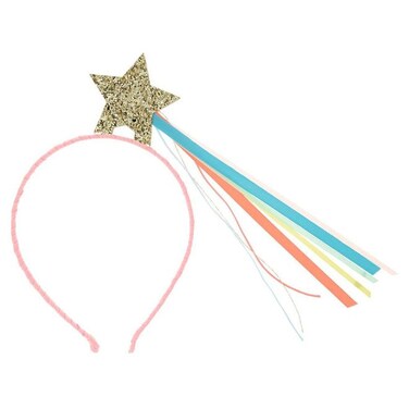 The star has a bright tail crafted from ribbons and cord, which will swish as you move around.The metal headband is wrapped in pink grosgrain ribbonThe star is crafted from chunky gold glitter fabric, on the front and backThere is a beautiful tail on the star made from ribbons, in pink, mint, yellow, blue and neon, and cord, in pink, teal and gold.Suitable for ages 3+Product dimensions: 5.75 x 7.25 x 0.25 inches