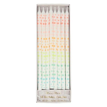 They are perfect for birthday parties or space themed parties.These candles feature stars in a rainbow of colours - neon pink, pale pink, orange, yellow, mint and blueThe pack includes clear plastic candle holdersPack of 16.Product dimensions:Candle height - 146mm