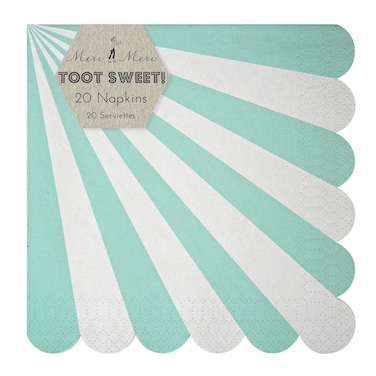 - A stylish party napkin with an aqua and white stripe, finished with a scollop edge.