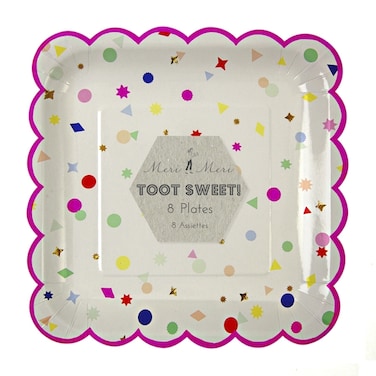 - A scatter of primary colors and geometric patterns feature on these bright and cheerful party plates.