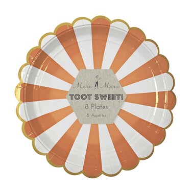 - These beautifully decorated party plates feature a radial orange and white stripe pattern and a scollop edge with gold banding.