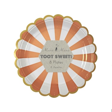 - These beautifully decorated party plates feature a radial orange and white stripe pattern and a scollop edge with gold banding.