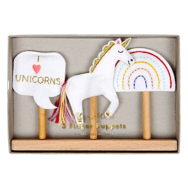 The puppets are hand-crafted in felt with colored stitching, and come in a luxury presentation pack with wooden base.Pack contains 3 finger puppets in 3 styles.