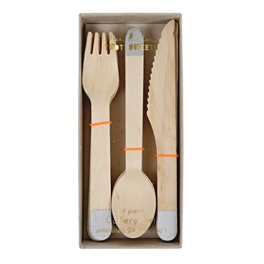 - A set of cute party cutlery crafted in light colored birch wood and finished with shiny silver foil.