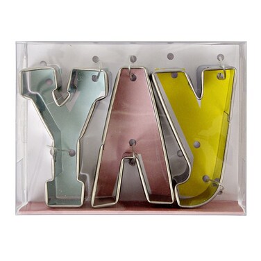 The three cutters spell out the word Yay. They come in a cute and colorful presentation box.Pack contains 3 stainless steel cookie cutters.Cutter depth: 1 inch.Pack size: 1 x 4 x 3 inches.
