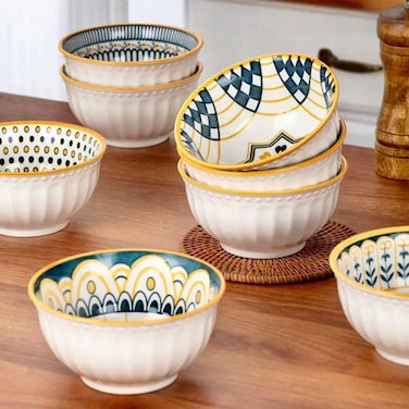 Choose this six-piece ceramic bowl set, which offers the perfect size and versatility for serving a wide range of meals, from rice and cereal to soup, ice cream, and individual desserts. These bowls are stackable and easy to clean, thanks to their unique fluted design with smooth glaze. This set is safe for dishwasher, microwave, and freezer use and is more durable than stoneware, ensuring its long-lasting quality.