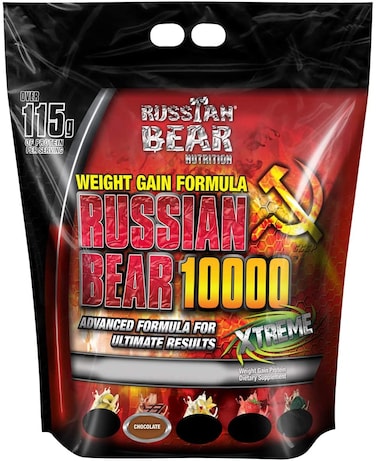 Russian Bear 10000 Weight Gainer Chocolate, 15 lbs. 10000 WEIGHT GAINER BAG CHOC 15LB 3/CS. 1863 calories per serving to bulk up and build maximized lean muscle mass Per Serving ( 470 gm), 121g of high quality protein to bulk up and satisfy athletic needs, provides 81g of amino acids