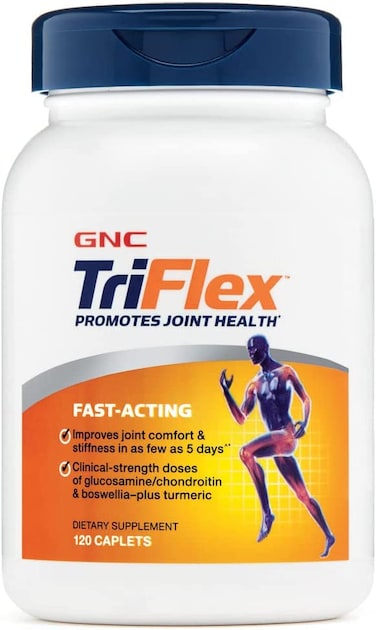 GNC TriFlex Fast-Acting: Promotes Joint Health GNC TriFlex Fast-Acting caplets contain ingredients that help support healthy joints. The product's potent ingredients help improve joint discomfort and stiffness and increase flexibility and mobility. The formula features turmeric, a plant originally found throughout Southeast Asia and a popular ingredient in Ayurvedic medicine. Ingredients such as Boswellia serrate extract, glucosamine and chondroitin may support improved joint function, comfort and health. This GNC joint supplement also features MSM to help strengthen cartilage. For optimal results, take two capsules, twice a day. The product is most effective when taken with food. Benefits: Features ApresFlex to help improve joint discomfort, stiffness and mobility Contains glucosamine and chondroitin to support joint health Includes MSM to promote healthy articular cartilage.