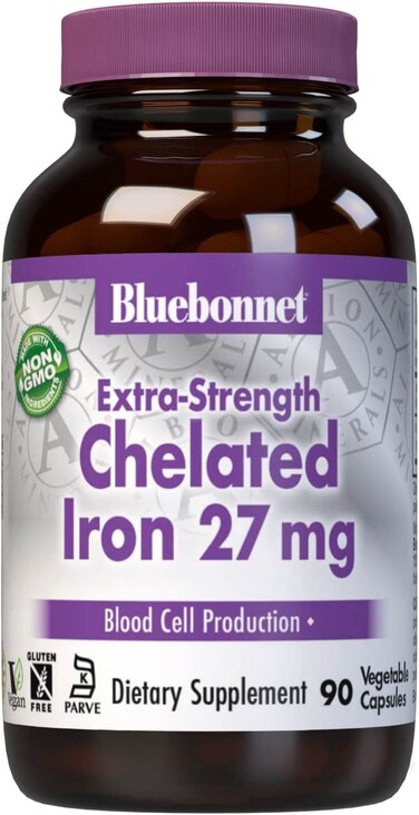 Bluebonnet's Chelated Iron 27 mg Capsules contain a gentle, non-constipating form of iron known as Ferrochel, a patented, fully reacted chelated ferrous bisglycinate from Albion. Available in an easy-to-swallow vegetable capsule for maximum assimilation and absorption. Set Contains: Contains 27 mg of Iron from Ferrous Bisglycinate ChelateFerrochel a gentle, non-constipating Iron Albion Chelated Mineral Vegetable Capsules Soy-Free, Gluten-Free, Non-GMO, Kosher Certified, Dairy-Free, Vegan