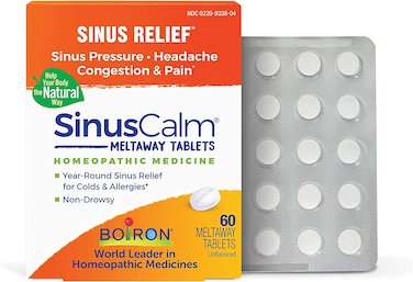 Unlike conventional medications that mask full-blown symptoms, Boiron SinusCalm tablets are specifically designed to relieve nasal congestion, sinus pain and pressure, and headache due to the common cold or allergies. This homeopathic sinus relief medicine targets sinus pain with a stuffy or runny nose. Borion SinusCalm also works as a sinusitis treatment by providing natural sinus relief and runny nose relief. The tablets dissolve quickly under the tongue without water, chewing, or swallowing pills. SinusCalm is non-drowsy and phenylephrine-free, and won’t interact with other medications or supplements, including those for colds and allergies. It is not habit-forming and there’s no risk of a rebound. It won’t mask symptoms of a more serious condition. Recommended for everyone ages 6 and up, SinusCalm is available over the counter in a box of 60 unflavored tablets. It also comes in multidose tubes of slightly sweet melt-away pellets. Additionally, Boiron offers RhinAllergy, ColdCalm, and ThroatCalm.