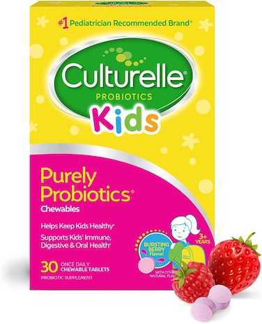 Help keep your kids healthy with Culturelle Kids Chewables, the #1 Pediatrician recommended brand. Culturelle Kids daily probiotic contains Lactobacillus rhamnosus GG, which works naturally with your child's body to help support both immune and digestive health. These great tasting mixed berry flavored chewables are a safe and effective way to help keep your kids happy and healthy. Promotes Immune Support The most clinically studied probiotic in children, Lactobacillus rhamnosus GG, helps support their natural immune defenses, by working in your child's core where 70% of their immune system resides. Digestive Health Restores the natural balance of good bacteria in their digestive tract to help support a healthy digestive system.