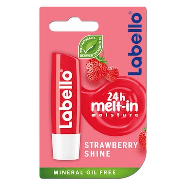 - LABELLO Strawberry Shine Lip Care Balm gives a touch of delicate colour and prettifies your lips with a soft shine delights your lips with a fruity strawberry aroma