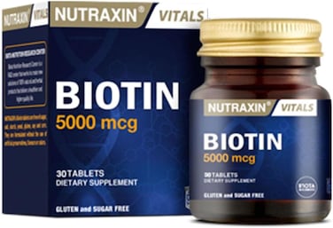 Nutraxin Biotin 5000 mcg is a dietary supplement that provides a high dose of biotin, a B-vitamin essential for various bodily functions. Each package contains 30 tablets for a month's supply. Benefits: Hair Health: Biotin is known for promoting healthy hair, making it shinier, stronger, and potentially reducing hair loss. Skin and Nail Care: Biotin can enhance the appearance and strength of nails and contribute to healthier skin. Metabolism Support: Biotin plays a role in converting food into energy and supporting overall metabolic function. How to Use: Take one tablet daily, preferably with a meal or as directed by a healthcare professional. Swallow the tablet with water or a beverage of your choice.