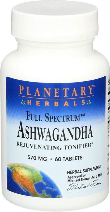 Planetary Herbals Ashwagandha Full Spectrum 570 mg 60 Tablets - Natural tonic - Ashwaganda is commonly used in Ayurvedic medicinal herbs to help the body adapt to physiological and psychological stress. Ashwaganda collects whole root powder with root extract to maintain all nutrients of nutritional value. The result is a renewed body energy, increased stress resistanceProduct Features: Brand: Planetary HerbalsType: Diuretics SupplementTargeted Group: UnisexProduct Size: 60 TabletsProduct Form: TabletsServing Size: 2 TabletsNumber of Servings: 30Weight: 0.07 kgDimensions: 4.50 x 9.00 x 4.50 cmUPC A: 21078105343