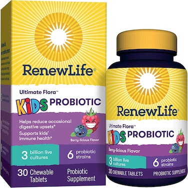 Relatest Life Kids 3 Billion Ultimate Flora Probiotic Chewable Tablets is made up of 3 billion cultures and 6 specially selected strains to reduce occasional stomach discomfort and support digestive balance. Each tablet is bursting with delicious berry-licious taste and is naturally sweetened with tooth-friendly xylitol with no artificial sweeteners, flavours or colours. Designed specially to support your child's immune health. Comes in a pack of 30 capsules. Set Contains: Renew Life Kids 3 Billion Ultimate Flora Probiotic Chewable Tablets, 30 ct