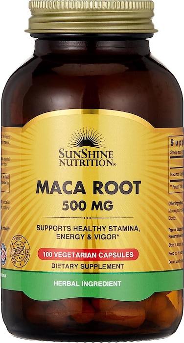 Sunshine nutrition's Maca Root Capsule contains the medicinal Maca plant that mainly grows in the mountains of Peru. It is known as Lepidium meyenii, sometimes referred to as "Peruvian Ginseng". Maca Root is known as a nutritious food source that comprises essential vitamins & minerals which contribute to support energy, stamina, and vigor. SUGGESTED USE: As a dietary supplement for adults, take one (1) capsule daily, preferably at mealtime or as directed by your health care practitioner. FREE OF: Gluten, dairy, sugar, artificial flavours & preservatives, colours, sweetener, wheat, and soy. Set Contains: 100 capsules