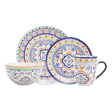 This set includes 16 pieces including dinner plates salad plates bowls and mugs all made from high-quality porcelain. Each piece features a unique and vibrant multi-coloured design making it perfect for both everyday use and special occasions.