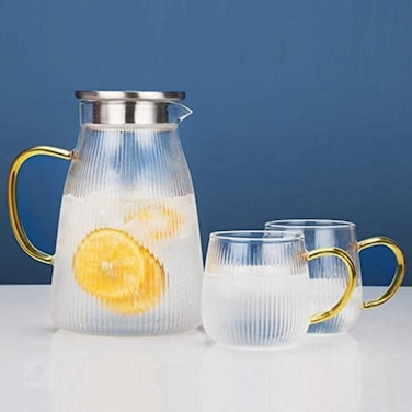 - 1Chase️ Heat Resistant Borosilicate1500 ml Glass Water Pitcher With Stainless Steel Strainer Lid With Set Of 2 Pcs 350 ml Glass Mugs For Tea, Coffee, Juice, Milk And For Daily Use