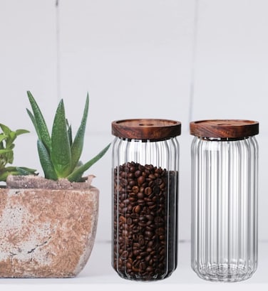 - 1Chase Borosilicate Stripe Glass Food Storage Jar With Acacia Wood Air Tight Lid, Handmade Glass Canister For Kitchen Pantry Organizer, For Storing Pasta, Nuts, Coffee, Snacks, Set Of 2, (900 ml)