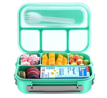 - STURDY AND ROOMY CAPACITY: This 1300 ML Bento Lunch Box features four roomy sections that are ideal for holding a range of items, such as snacks, fruits, desserts, and entrees. MATERIAL: Food-grade, BPA-free plastic that is non-toxic, odorless, and ecologically friendly is used to make this product, making it both durable and safe. makes certain that you and your family eat safe, healthful meals. SAFE FOR DISHWASHER, FREEZER, AND MICROWAVE: Put your meal in the microwave (without a lid), give it a quick wash in the dishwasher, and freeze it hassle-free. LEAK-PROOF AND REUSABLE: A rubber gasket in every compartment keeps leaks at bay while preserving the freshness and separation of your food. Shockproof and long-lasting design for daily use. INCLUDES SPOON AND SAUCE BOX: This lunch solution comprises a spoon and a leak-proof dip box, completing the set. You don't need to look for cutlery. IDEAL FOR ALL AGES: Great for children, adults, and young children. Excellent for workplace lunches, school, work, and picnics. helps regulate portion sizes and create a balanced diet.