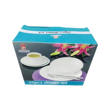Made from high-quality porcelain, this set includes 20 pieces, including dinner plates, salad plates, soup bowls, and mugs. The round shape and white colour of the dinnerware are complemented by a beautiful gold trim, adding a regal and glamorous touch.