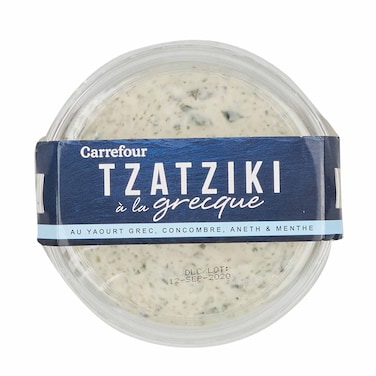 • Carrefour Tzatziki Extra is having yoghurt as the first ingredient in this extra creamy tzatziki with traditional cucumber sea salt and garlic