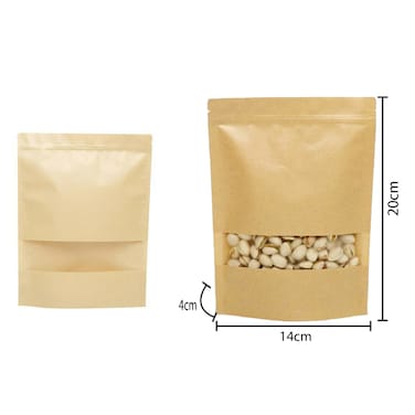 Food Pouches 12pcs Size 20x14x4cm, Kraft Stand Up Food Bags, Zip Lock Reusable Packing Pouches with Transparent Window and Tear Notch Thicken Heat Sealable, or Storing, Cookie and Snack, Paper pouch