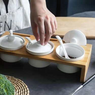 There are 3 sets of this ceramic seasoning pot, which can hold 3 kinds of seasonings. The seasoning jar has a matching wooden lid which is convenient and practical. The design of the tray can keep the kitchen countertop clean and make your kitchen more tidy and beautiful.which is convenient and practical. The design of the tray can keep the kitchen countertop clean and make your kitchen more tidy and beautiful.