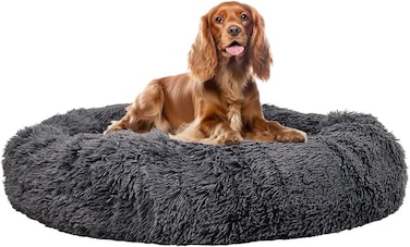Faux fur round donut dog bed, Anti-anxiety self-warming pet bed, Large round plush dog bed for all sized pets, Soft fluffy warm to improved sleep, Machine washable 85 cm (Grey)
